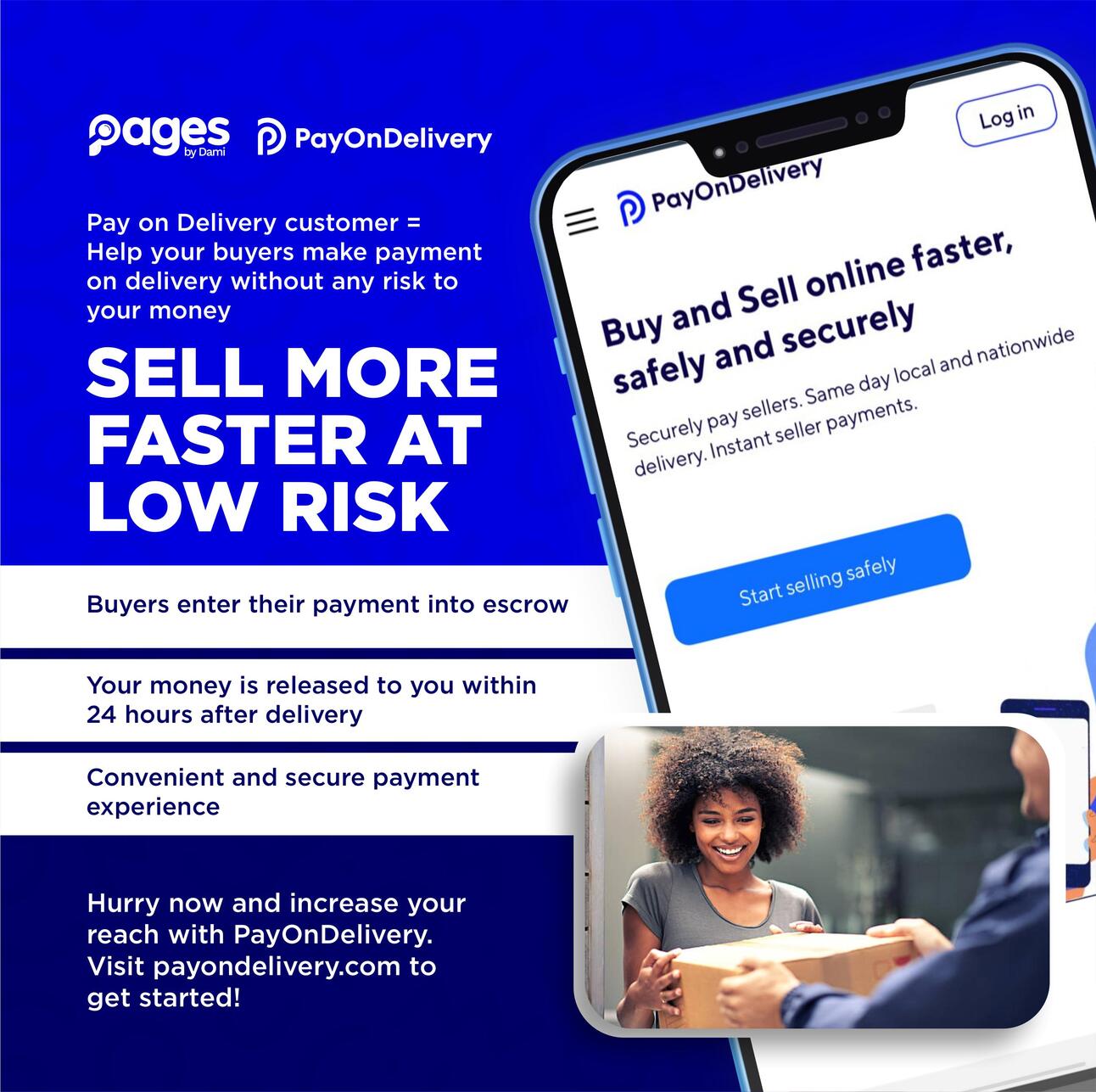 Before you start shaking your head and discarding the idea, its not difficult and all you need to do is use our vetted partner Payondelivery to achieve this. They will not only help you collect your money from your customer and keep in escrow, they will also carry out the delivery and any possible returns. Taking away all the stress from you.